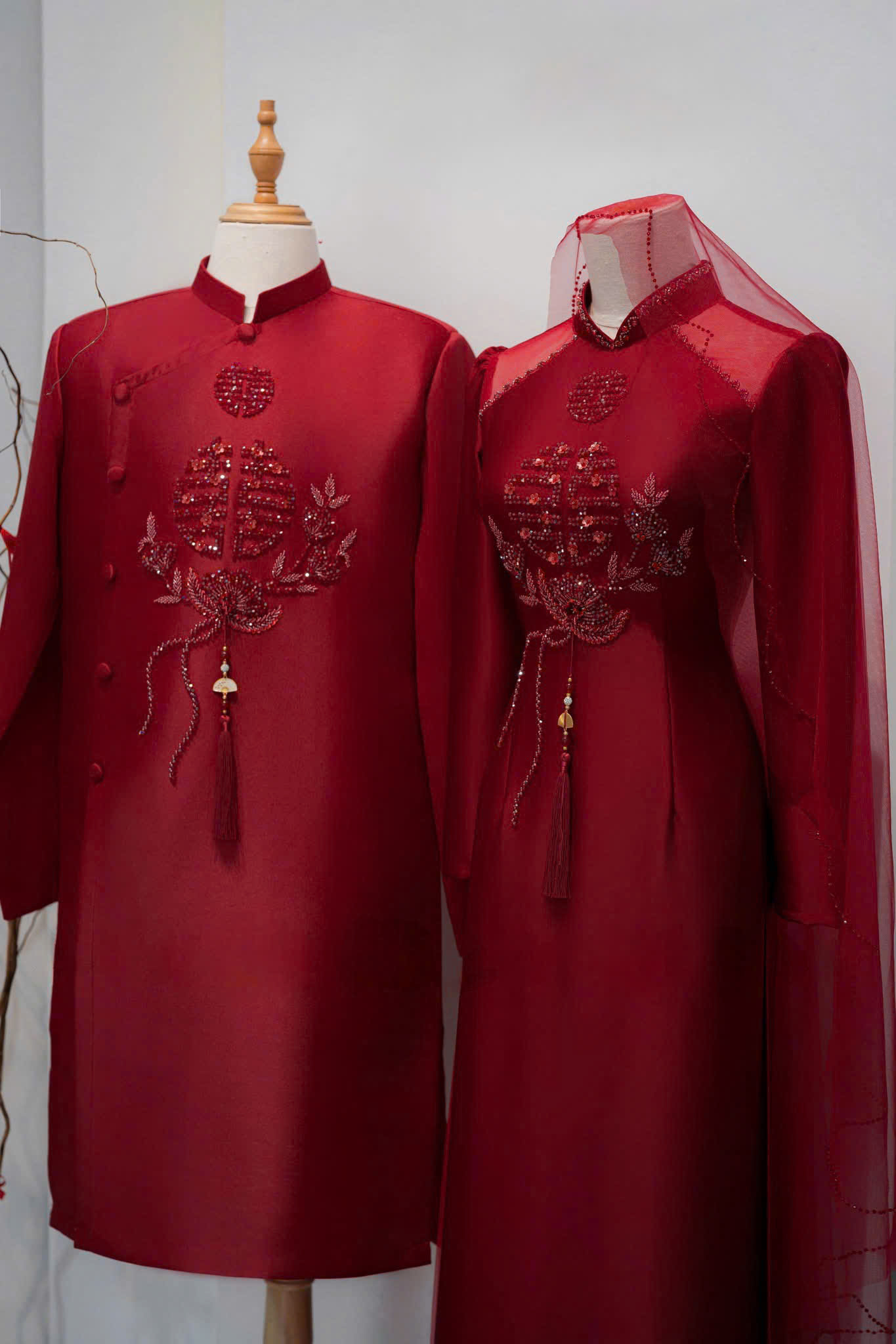 Nghệ Thuật Thêu Tinh Xảo: Các họa tiết trên áo là kết quả của đôi bàn tay khéo léo từ những người thợ thủ công lành nghề. Từng đường kim mũi chỉ, đặc biệt là họa tiết “Phượng múa Rồng bay” hoặc hoa văn “Trầu Cánh Phượng” cách điệu, được thêu một cách tỉ mỉ, biến tấm áo thành một bức tranh sống động, đầy ý nghĩa về sự hòa hợp và phúc lộc vẹn toàn.