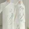 Nghệ Thuật Thêu Tinh Xảo: Các họa tiết trên áo là kết quả của đôi bàn tay khéo léo từ những người thợ thủ công lành nghề. Từng đường kim mũi chỉ, đặc biệt là họa tiết “Phượng múa Rồng bay” hoặc hoa văn “Trầu Cánh Phượng” cách điệu, được thêu một cách tỉ mỉ, biến tấm áo thành một bức tranh sống động, đầy ý nghĩa về sự hòa hợp và phúc lộc vẹn toàn.