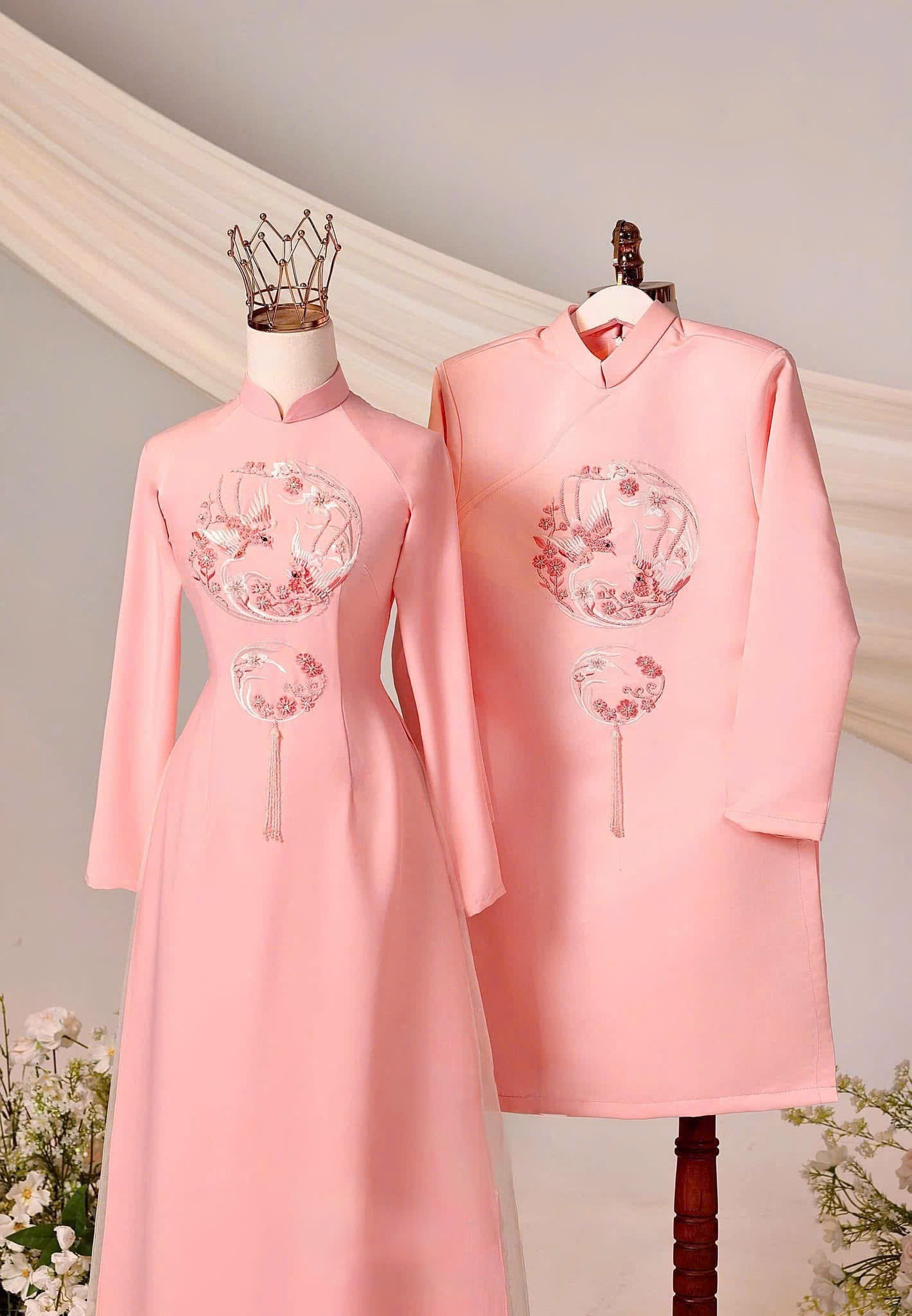 Nghệ Thuật Thêu Tinh Xảo: Các họa tiết trên áo là kết quả của đôi bàn tay khéo léo từ những người thợ thủ công lành nghề. Từng đường kim mũi chỉ, đặc biệt là họa tiết “Phượng múa Rồng bay” hoặc hoa văn “Trầu Cánh Phượng” cách điệu, được thêu một cách tỉ mỉ, biến tấm áo thành một bức tranh sống động, đầy ý nghĩa về sự hòa hợp và phúc lộc vẹn toàn.