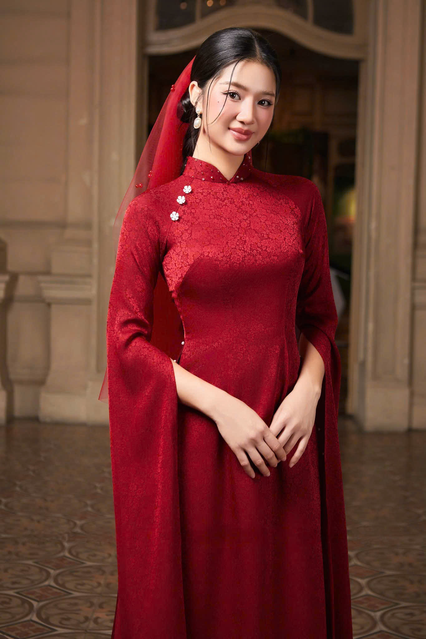 Màu Sắc Biểu Tượng: Tông màu chủ đạo là đỏ thắm truyền thống – biểu tượng của may mắn, hạnh phúc và tình yêu nồng cháy. Hoặc, với những cô dâu hiện đại, ADC077 cũng có thể được sáng tạo với các màu sắc như hồng ngọc, vàng hoàng gia… vẫn giữ trọn vẹn nét đẹp trang trọng.